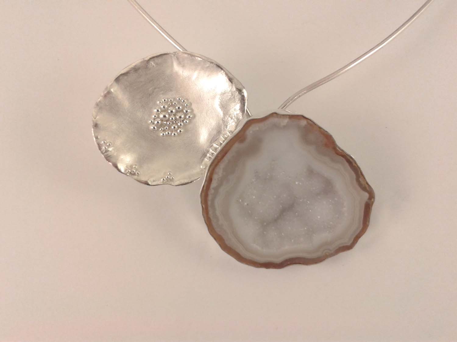 ST733 Druzy Agate set in silver, Oyster Shell style on silver wire neck band.